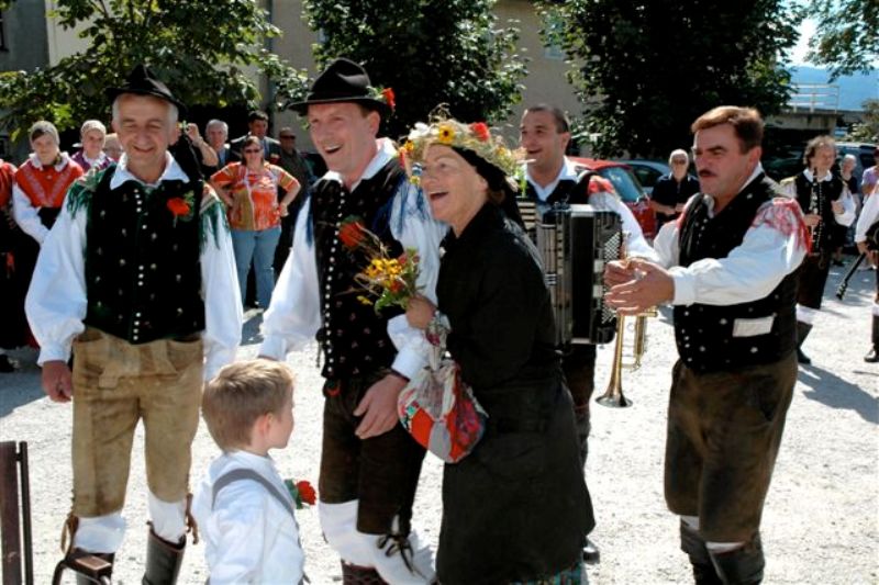 | »Medgeneracijski folklorni skupini Bohinj« * je bila zaupana zahtevna naloga. V soboto, 11. 9. 2010, so stari in mladi folkloristi za prvo Avsenikovo poroko uprizori »šrango«, pospremili ženina in nevesto do matièarja v Avsenikovi galeriji ter pred oltar v begunjski cerkvi. Zopet se je potrdilo, kako pomembno je medgeneracijsko sodelovanje, saj so na »šrangi« Ivan in njegovi mlajši pomoèniki ženinu družno moèno otežili pot do neveste. Fantje so mu ponudili »Ta èrno« (slamnato) nevesto, ki jo je moral izplaèati. Ženin se je pošteno prepotil, saj brez žaganja seveda ni šlo. Prava nevesta se je pripeljala s fièkom, ki je imel nekaj starostnih težav. Spet je, tokrat na »biciklu«, vskoèila »Ta èrna« nevesta, dokler je konèno niso medse sprejeli èlani Gorenjskega kvinteta. Šele prava nevesta je preprièala fante, da so odprli »šrango«. Veselo so zaplesali in ju pospremili pred matièarja in v cerkev. Na ohceti pri Avseniku so folkloristi zaplesali »Svatovsko«, mladoporoèenca pa sta zaplesala z »jerbasom«, v katerem je bila pogaèa, ki sta jo nato razdelila med svate. Ženina in nevesto so morali še »porajkljati« (povezati z vrvjo), da bo njuna zveza še bolj trdna. Medgeneracijska folklorna skupina Bohinj, ki zaživi ob takih izjemnih dogodkih, je svoje delo odlièno opravila in po starih obièajih popeljala dva mlada – Natašo in Boruta na novo življenjsko pot. |