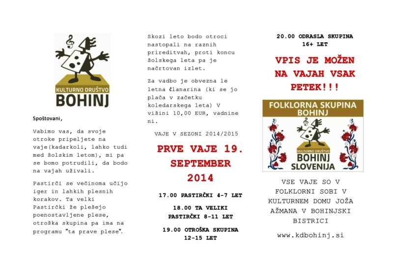 Vaje bivših folklornikov in tistih, ki bi želeli nastopiti na prireditvi ob praznovanju 60-letnice odrasle in 30-letnice otroške folkorne skupine se zaènejo v petek, 12. septembra ob 20. uri v folklorni sobi Kulturnega doma Joža Ažmana v Bohinjski Bistrici.